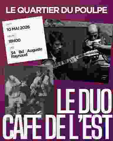 Le dimanche 10 Mai, Le Quartier du Poulpe troque son habituel tumulte pour une soirée placée sous le signe de l'élégance et de la complicité musicale. Nous avons le plaisir d'accueillir Le Duo Café de l'Est , une formation née d'une rencontre évidente en 2016 entre deux passionnés : Patrick et Jean-Marc. Au programme : Laissez-vous transporter par un voyage sonore à travers les époques. Guitare et harmonica s’entremêlent pour revisiter avec brio : -✨ Les plus grands standards de Jazz -💃 Les rythmes solaires de la Bossa Nova -🎷 L’énergie communicative du Swing -🎤 Les pépites de la Chanson Française Que vous soyez puriste de jazz ou simplement amateur de bonnes ondes pour finir le week-end, c'est le rendez-vous à ne pas manquer. - Date : Dimanche 10 Mai 2026 - Heure : 18h00 - Lieu : Le Quartier du Poulpe, 34 Bd Auguste Raynaud, 06100 Nice - Entrée 15€ avec une boisson offerte ! ♿️Accès PMR ⎜Stationnement gratuit