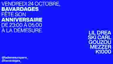 ⚠️ ADRESSE : LA DÉMESURE 43 RUE DU FAUBOURG MONTMARTRE, 75009 PARIS BAVARDAGES FÊTE SON ANNIVERSAIRE AVEC LIL DREA ET SKI CARL VENDREDI 24 OCTOBRE DE 23:00 À 05:00 @ LA DÉMESURE / 43 RUE DU FAUBOURG MONTMARTRE, 75009 PARIS