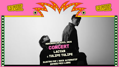 CONCERT : Lacyan & Tulipe Tulipe 🔥 TULIPE TULIPE Chez Tulipe Tulipe on commence tout nos sons en criant. On déblatère une vie violente, précaire. On se défoule sur notre quotidien qui a plus aucun sens en saturant les guitares au max, en défonçant une batterie, en secouant les murs avec la basse et on chiale sous autotune, le tout autour d’une bagnole qui crame après un accident sur le périph de Lyon. Alors regardez pas l’accident, venez et on agrave la casse <3 👉 https://www.instagram.com/tulipetulipeband/ 👉 https://www.deezer.com/fr/track/3674911682 LACYAN Lacyan est un duo français de pop alternative composé de Gaël Sabatier (compositeur) et Mathis Lardier (auteur-interprète). Leur musique oscille entre mélancolie et lumière, électro et émotion brute. Inspirés par la pop, l'electro et la techno, ils façonnent un univers introspectif et sensoriel, où chaque morceau est une plongée dans l’âme. 👉 https://www.instagram.com/lacyan__/ 👉 https://link.deezer.com/s/32KdNCTmwrHLl60n6uKsx 📍 LA PENTE : 14 montée des Carmélites, 69001 LYON 📆 Mercredi 29 Avril 2026 ⏰ 20h - 23h30 🎫 Entrée prix libre (cash / CB) ❤️ BAR ANTI RELOU 🖕 Nos événements sont des espaces de liberté, d'égalité et de bonheur, c'est pourquoi les actions ou comportements suivants ne sont pas tolérés : racisme, sexisme, transphobie, homophobie, misogynie, discriminations, intolérances, ainsi que l’irrespect des règles de consentement.