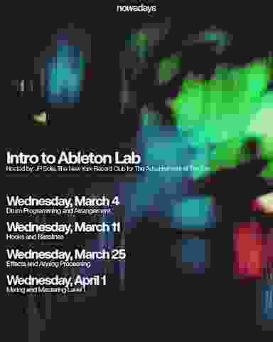 This workshop series focuses on learning the essential tools to translate your ideas into sound. You’ll learn how to construct grooves, write hooks, and build tracks that hold up in a club environment. After each lecture, stay for two hours of lab time, where you can connect with peers, exchange ideas, collaborate, and test your tracks on the club’s sound system. We recommend beginners commit to the entire series for the best experience, but drop-ins are welcome. Space is limited, and tickets are $20 per session. Laptops with Ableton 12 Suite and headphones are highly recommended. See promotional links for access to a free 30-Day demo of Ableton Live 12 Suite. Discounts are available upon request. This event is hosted by The New York Record Club for the Advancement of the Arts and JP Solis, co-founder of Dubspot, the first Ableton Certified Training Center in North America. /// Violence, non-consensual touching, racist, homophobic, transphobic, sexist, ageist or other discriminatory language, and leering are not allowed within our walls or in our back yard. If someone says or does something to make you feel uncomfortable while you’re here, let us know. /// Accessibility: The wheelchair entrance to our indoor space is in the driveway, which is the access point most commonly used to enter Nowadays. During parties the driveway gate is locked, so please ask staff at the street entrance for assistance with entry. All of our bathrooms are gender-neutral. There is one accessible stall indoors. Just ask any Nowadays staff member for the key, and they can show you the way.