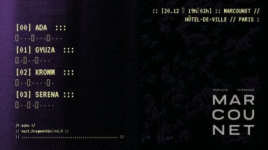 Nuit Fragmentée présente Artefact Artefact est une soirée où le son se fragmente, où la machine laisse apparaître ses failles. Un espace pour les erreurs heureuses, les matières en suspension, les rythmes en tension, en circulation. Nuit Fragmentée explore l’électronique comme un langage vivant, entre programmation, synthèse et énergie collective. Une line-up locale, pensée comme un réseau de particules sonores. Line up : Gyuza https://www.instagram.com/gyuza_arthur/ Ada https://www.instagram.com/adamantehrd/ Serena https://www.instagram.com/serenouch/ Kromm https://www.instagram.com/kromm.jpg/ ✨ Retrouvez également le mini Market sur le Pont Supérieur de la péniche à partir de 18h 🌭 Restauration sur place powered by Kromm / Leahduflot
