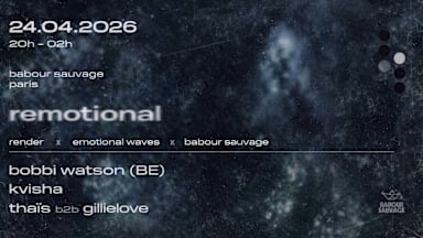 Render (Station Station) unites with Emotional Waves (Gimic//Radio Sofa) and Babour Sauvage to host a night of deep, minimal and bass driven electronic expérimentions featuring Bobbi Watson (be), Kvisha and Thaïs b2b Gillielove. Bobbi Watson (be) is a producer, dj and live performer who places storytelling at the heart of her musical exploration. With residencies at Gimic and Kiosk Radio, her sound weaves together organic techno, cinematic ambient and broken rhythms to create an immersive journey that shifts between trance and reverie. She is also one part of the Soum-Soum duo and the improvisational live act Pölen Biotape. Her debut EP was released on YUKU (Prague) in December 2025. kvisha is the minimal techno alias of the idm/bass/experimental artist qwqwqwqwa. kvisha is groove driven, deep, and explores sonic minimalism at the intersection of minimal techno, micro house, idm and psychedelia. Expect a heated dancefloor session that moves between hypnosis and joy. His music has premiered on minimal collective and be sure to check out his live set recording for the Berlin party series run by Kontext to get you in the mood. This will be a debut Paris performance for Kvisha. Thaïs is earning a solid reputation on the EU club and festival circuit as a deep digger, dj and sonic curator in the liminal realms of organic techno, textural rhythms and deep ambient. Her sets traverse between different electronic genres and flow with a unassuming weaving of emotion and storytelling. She runs the radio and event series emotional waves that bounces between Gimic Radio, Radio Sofa and Refuge Worldwide. She recently opened for Marco Shuttle at Essaim and played the famous Salon De Amateurs. Gillielove is one part of Render, a radio show on Station Station and irl exploration of experimental sounds on the fringe of deep listening and dance. Guided by dub sensibilities, broken rhythms, and a love of spacious sound design. Their productions are rooted in bass, texture, and experimentation, while their music explores the shadowy edges of low-end frequencies and psychedelia. Their music has premiered on Rhythmic Culture, pi pi pi and Mixmzg Worldwide. Their dj sets are all terrain, exploring outlier qualities in a range of genres. FR Render (Station Station) s'associe à Emotional Waves (Gimic//Radio Sofa) et Babour Sauvage pour organiser une soirée deep, minimal et bass musique, avec Bobbi Watson (be), Kvisha et Thaïs en b2b avec Gillielove. Bobbi Watson (be) est une productrice, DJ et artiste de scène qui place la narration au cœur de son exploration musicale. Résidente chez Gimic et Kiosk Radio, elle tisse un son mêlant techno organique, ambient cinématographique et rythmes brisés pour créer un voyage immersif oscillant entre transe et rêverie. Elle fait également partie du duo Soum-Soum et du groupe d’improvisation live Pölen Biotape. Son premier EP est sorti sur YUKU (Prague) en décembre 2025. kvisha est l'alias minimal techno de l’artiste idm/bass/expérimental qwqwqwqwa. kvisha est axé sur le groove, à la croisée de la minimal techno, de la micro house, de l’idm et du psychédélique. Pour faire faire une idée de son univers, on vous conseille son live enregistré pour la série de soirées berlinoises organisée par Kontext. Ce sera la première performance parisienne de Kvisha. Thaïs s'est forgé une solide réputation sur la scène des clubs et des festivals européens en tant que dénicheuse de perles rares, DJ et curatrice sonore, évoluant aux confins de la techno organique et de l'ambient. Elle anime la série de radios et d’événements « emotional waves », qui oscille entre Gimic Radio, Radio Sofa et Refuge Worldwide. Elle a récemment assuré la première partie de Marco Shuttle à Essaim et s’est produite au célèbre Salon De Amateurs. Gillielove est membre de Render, une émission de radio sur Station Station et une exploration en direct de sons expérimentaux à la frontière entre l’écoute et la danse. Guidés par une sensibilité dub, des rythmes brisés et un amour pour la conception sonore spacieuse, ses productions s’ancrent dans la basse, la texture et l’expérimentation. Sa musique a été diffusée en avant-première sur Rhythmic Culture, pi pi pi et Mixmzg Worldwide. -------------------------------------------- Horaires 20h-02h Tarifs Early : 8€ Regular : 10€ Door : 12€ 📍 Babour Sauvage Péniche face au Cabaret Sauvage, 59 Bd Macdonald Parc de la Villette 75019 Paris Ⓜ️ Métro ligne 7 : Porte de la Villette Ⓜ️ Métro ligne 5 : Porte de Pantin Tramway : Ella Fitzgerald ou Porte de la Villette 𝗦𝗨𝗜𝗩𝗘𝗭 𝗡𝗢𝗨𝗦 https://www.instagram.com/babour.sauvage Péniche - Pas d'accès PMR