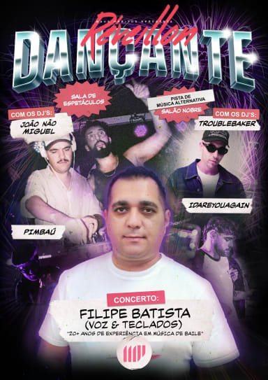 𝐑𝐞𝐯𝐞𝐢𝐥𝐥𝐨𝐧 𝐃𝐚𝐧𝐜̧𝐚𝐧𝐭𝐞, a festa que faltava no roteiro das PdA's sobe ao 4º andar com os ritmos de baile como pano de fundo. Sala de Espetáculos Com os Djs : João Miguel Pimbaú Concerto: Filipe Batista (Voz & Teclados) “20+ Anos de Experiência em Música de Baile” Pista de Música Alternativa Com os Djs: TROUBLEBAKER & IDAREYOUAGAIN